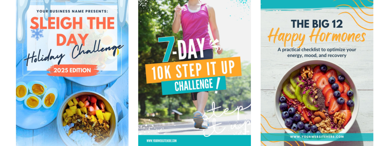 These include a wide range of ready-made resources such as 5-day challenges, lifestyle lead magnets (covering topics like sleep, stress, food, shopping, habits, and nutrition), recipe collections, workout guides, and seasonal campaigns for the holidays and New Year. If there’s something you’d like to revisit or repurpose, we’re happy to help.