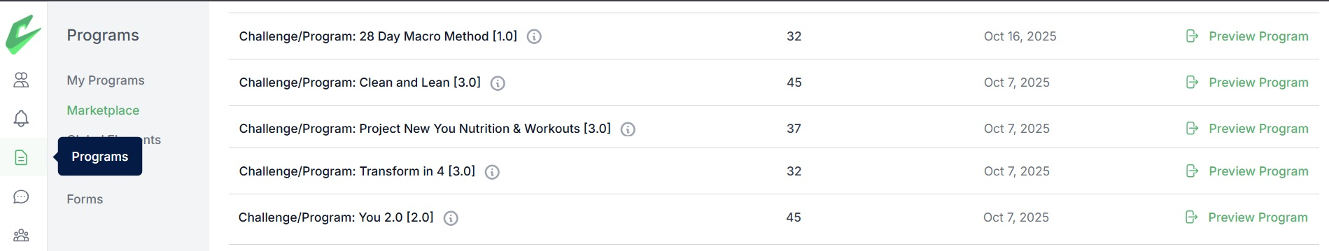 2. Go to Programs > Marketplace, search for the required program (such as You 2.0, Clean and Lean, or Project New You), and click on Preview Program.